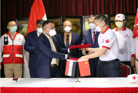 3月16日,在伊拉克巴格达,中国专家组领队与巴格达医学城代表交接证书。新华社发