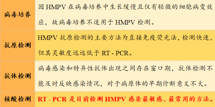HMPV感染诊断技术包括病毒培养、核酸检测、抗原检测和血清学抗体检测。